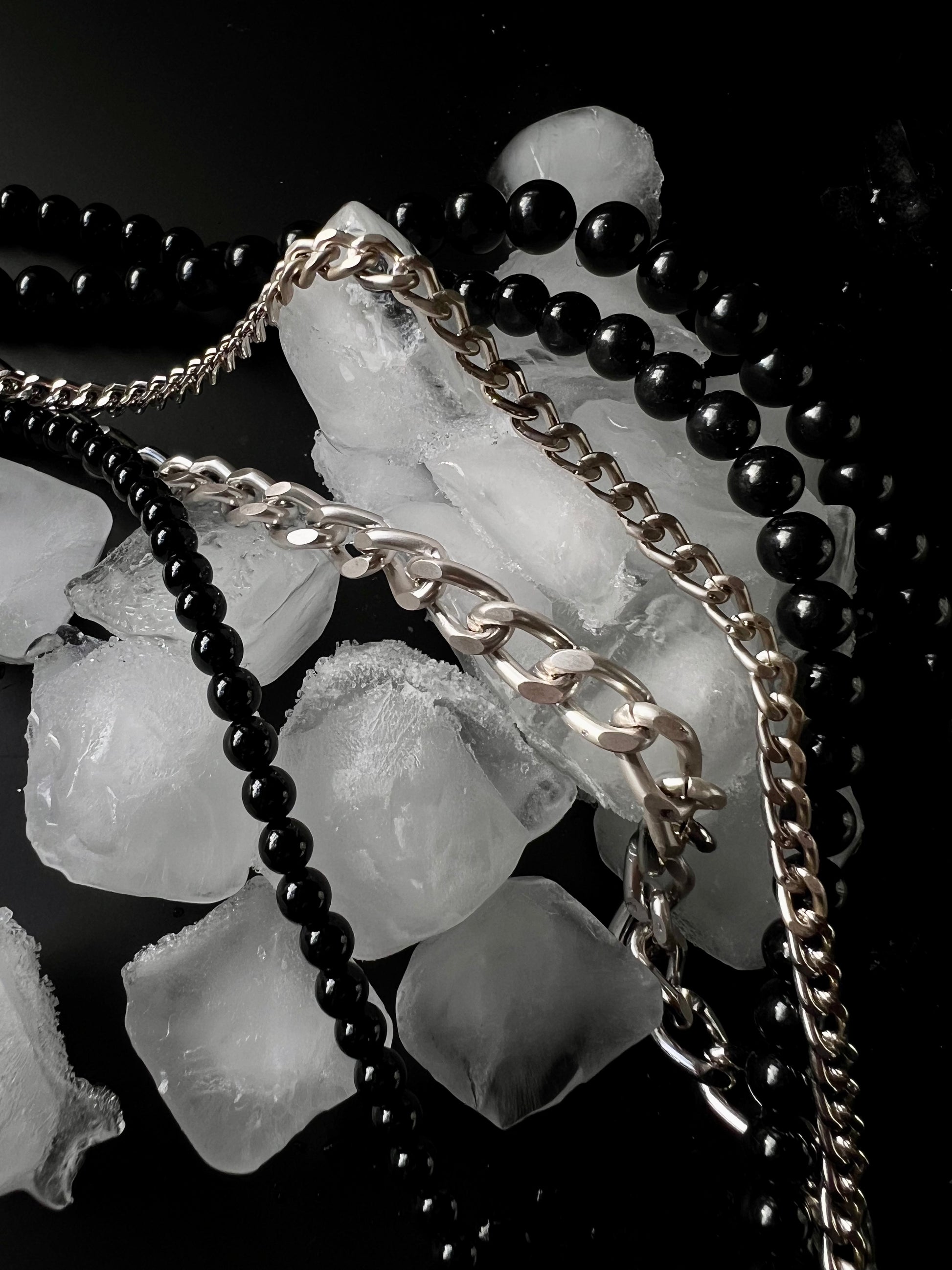 Collana media lunghezza, tre giri di perle nere e due giri di catene di dimensioni diverse