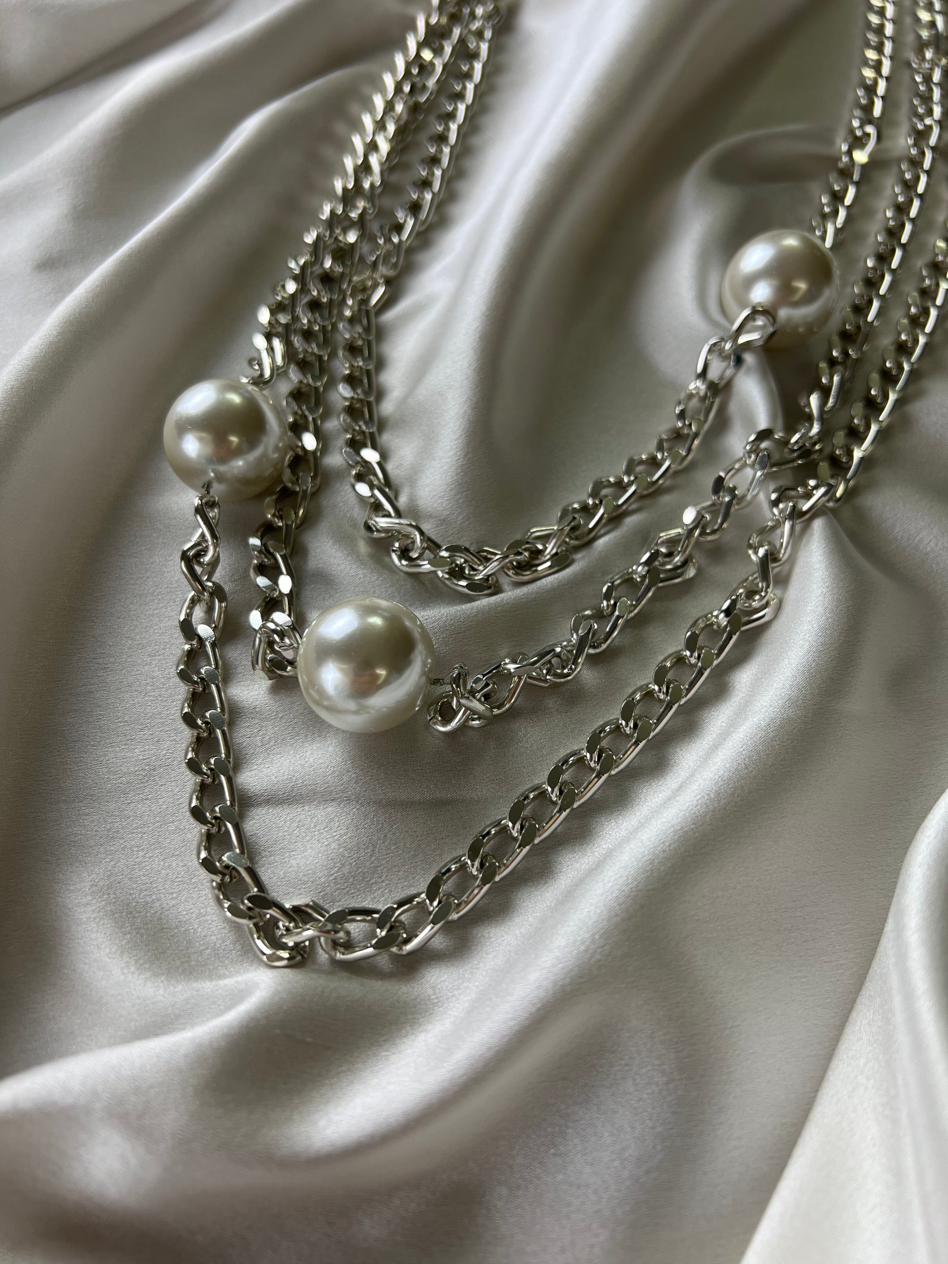 Collana di media lunghezza, tre giri di catena con inserto di tre perle.