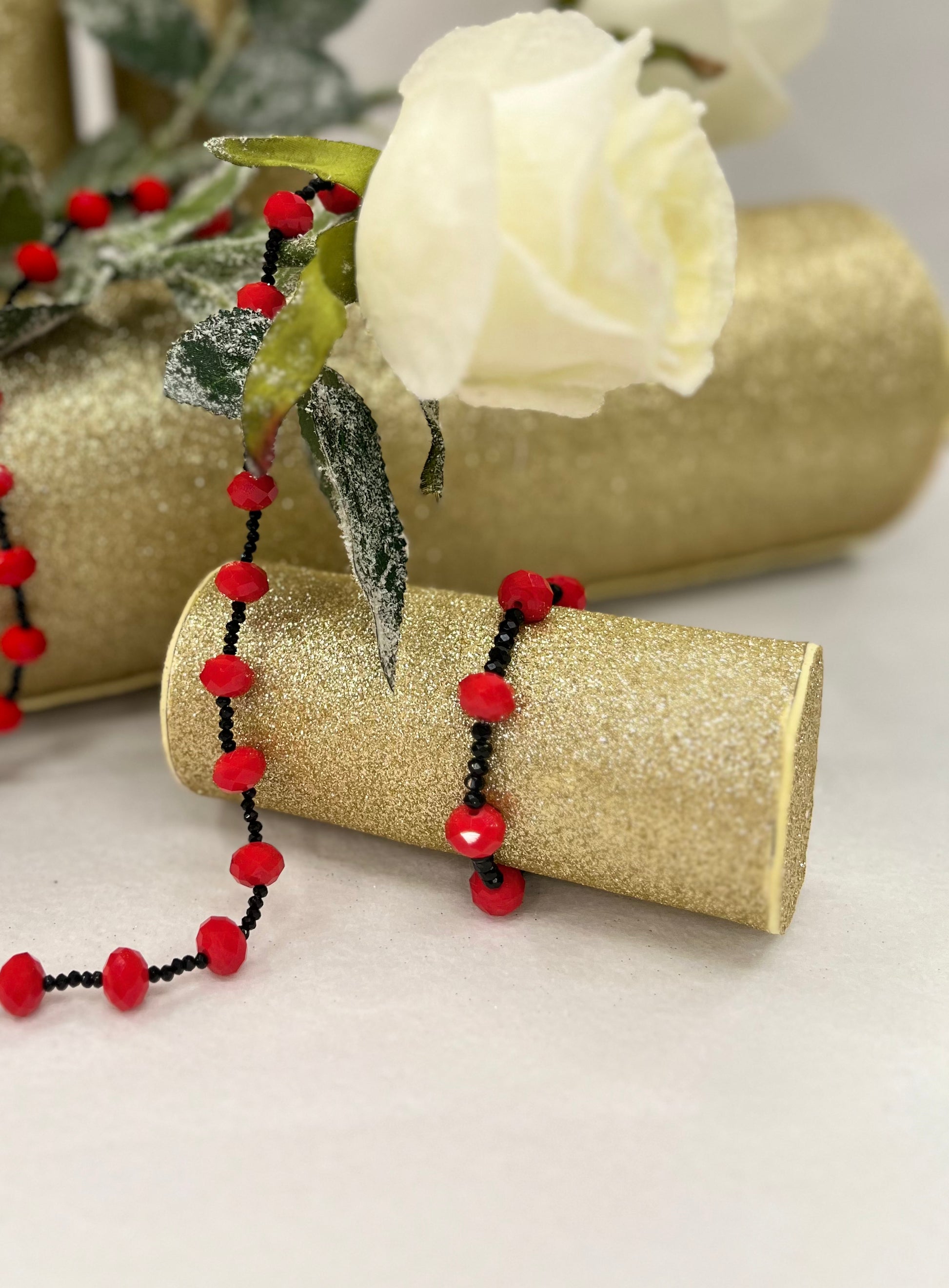 Un braccialetto vivace e raffinato, realizzato con piccole pietre nere intervallate da elementi rosso intenso. La combinazione dei due colori crea un contrasto luminoso e contemporaneo, perfetto per dare carattere a qualsiasi look.